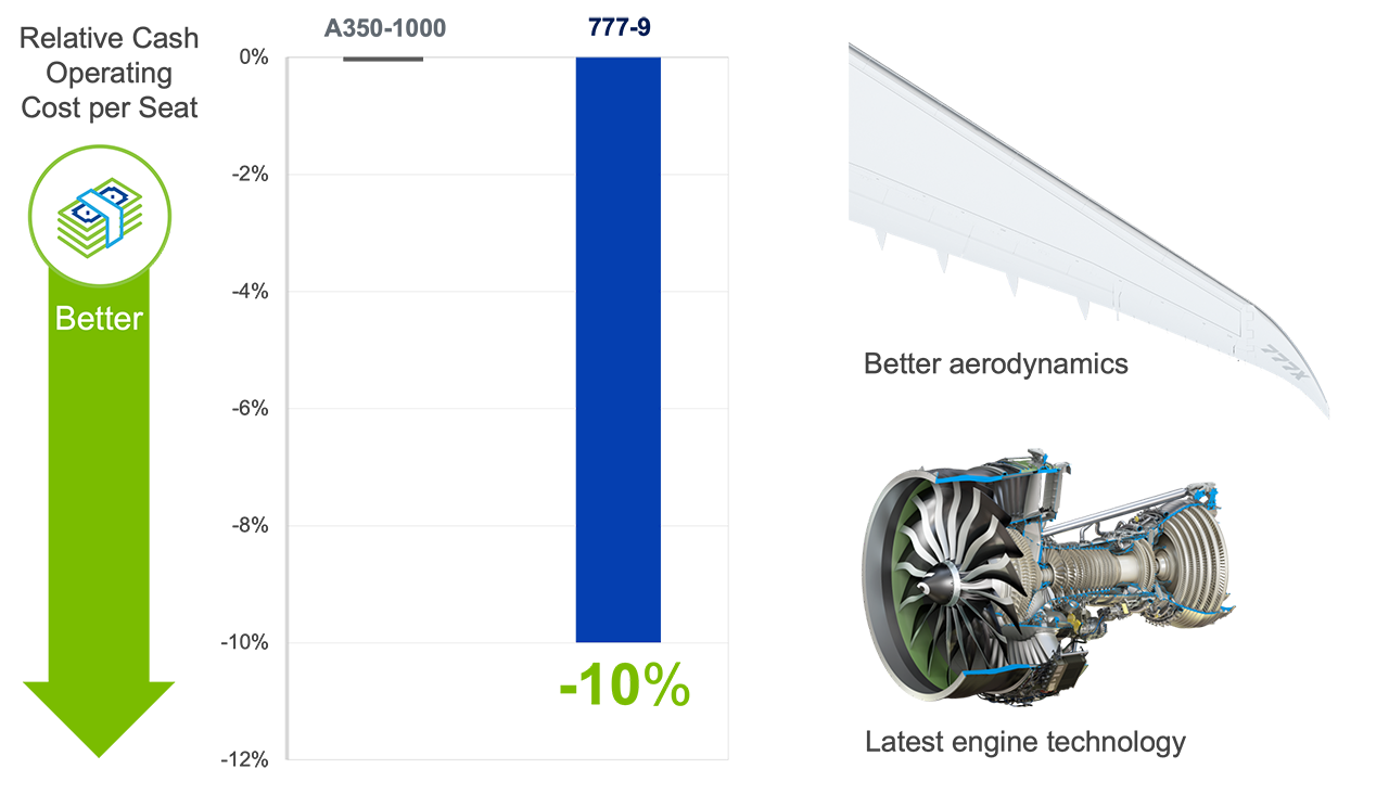 Longer wingspan than the A350-1000 results in better aerodynamic efficiency.