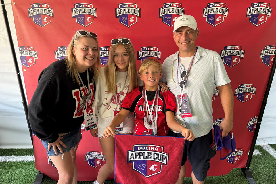 Since 2007, Boeing has proudly stood at the 50-yard line of Washington’s greatest football rivalry—the Boeing Apple Cup—straddling UW Husky purple and WSU Cougar crimson. At the 117th matchup in Pullman on Sept. 20, Boeing hosted 250 employees and their families, creating unforgettable memories rooted in tradition and pride.