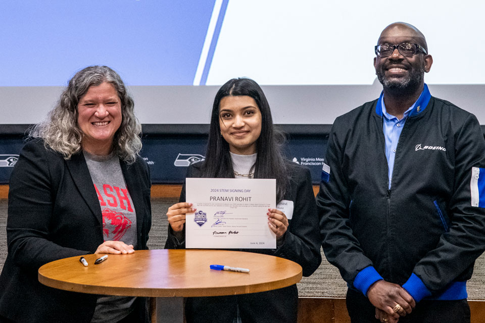 Players spend countless hours perfecting their football skills inside the Seattle Seahawks training facility in Renton, Washington. So, it’s only fitting that high school seniors from across Washington also gathered there to commit to honing their own skills with a focus on scoring a promising future in STEM careers.