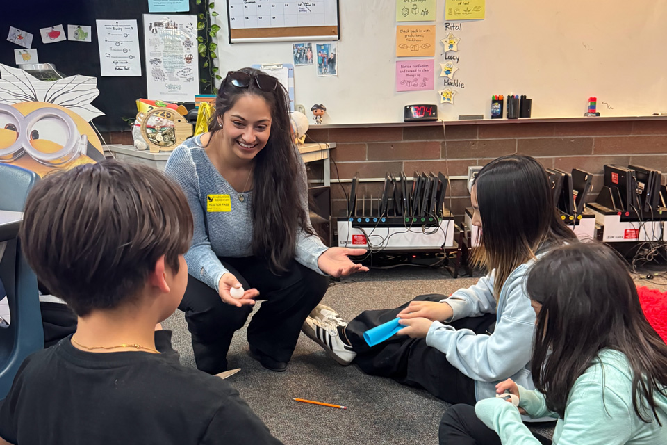 Preimesberger helps 4th grade students complete a STEM challenge. The students designed and created a device made of paper, paperclips, tape, and string to capture and carry a ping-pong ball using as few materials as possible.