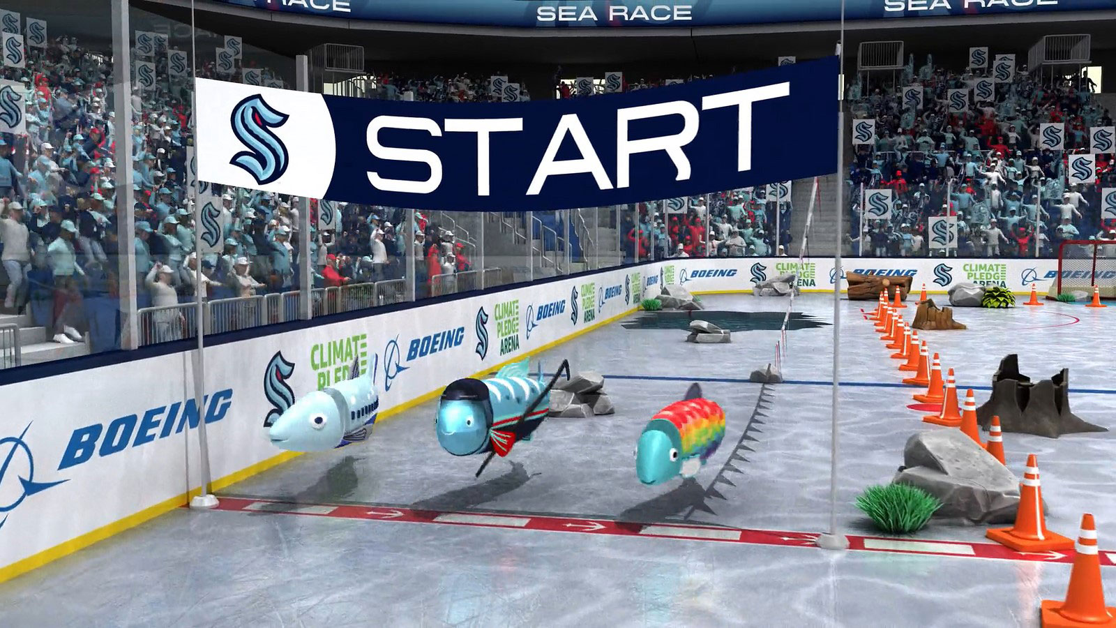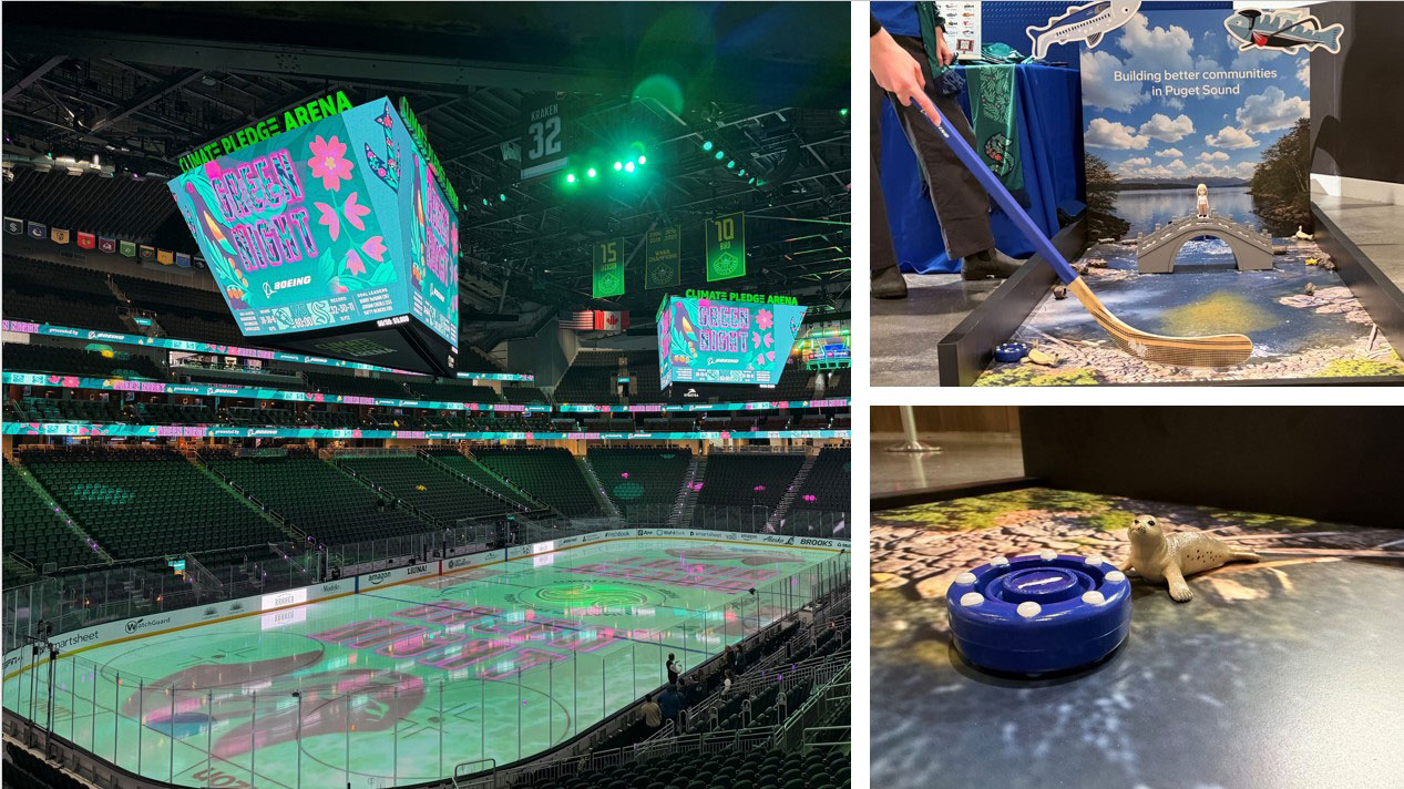 The scene: Boeing engaged Kraken fans on Thursday, April 2, as the Climate Pledge Arena concourse transformed into a sustainability exhibit that turned salmon migration challenges into a tactile learning experience. The exhibit featured a large floor graphic and hands-on hockey play that showed how water temperatures, toxic runoff and other hazards can make the long journey even harder for salmon.