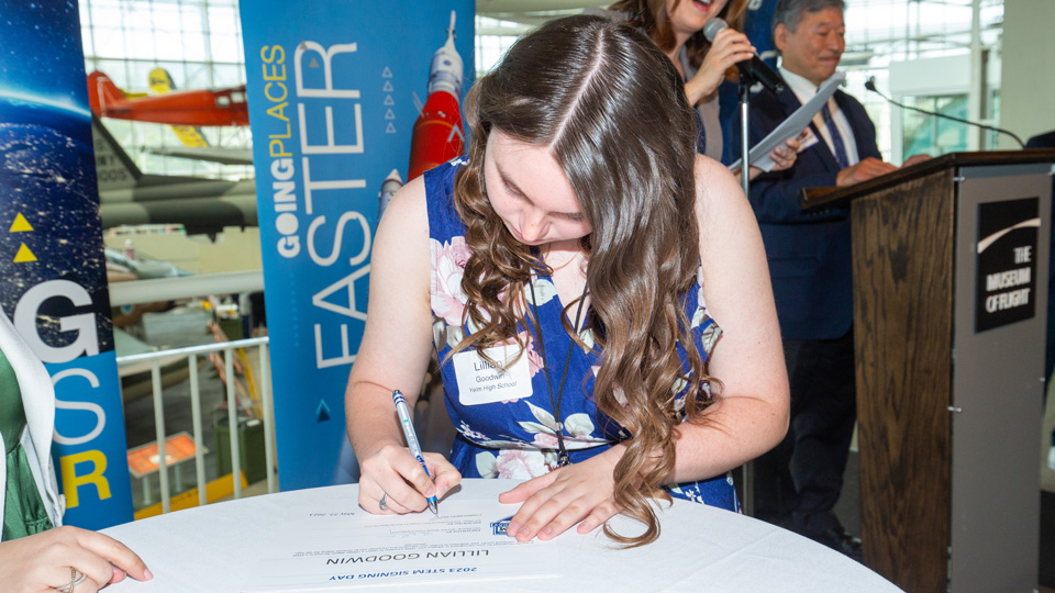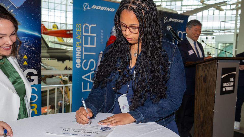 Hazra was one of 46 high school students who recently participated in two celebrations for the 2023 Washington state STEM Signing Day, presented by Boeing. One celebration was held at the Museum of Flight in Seattle and a second was held at Boeing Moses Lake.