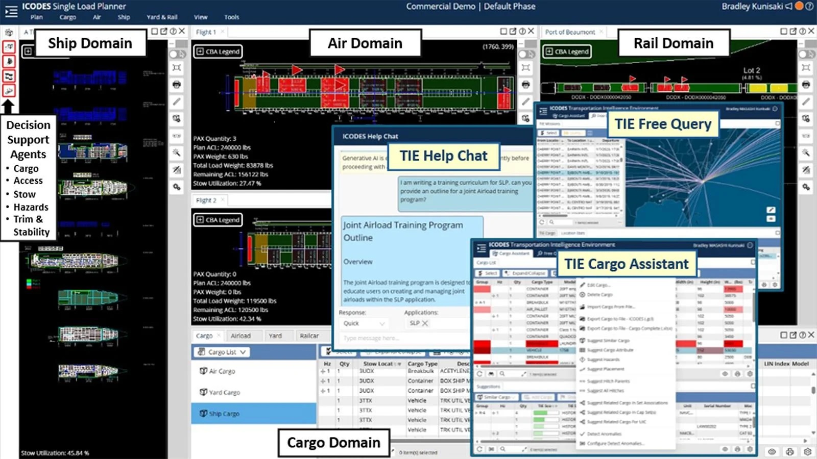 - Application prototypes: Prototype AI/ML tools include a Cargo Assistant to help enter and validate cargo data, a Free Query application with interactive map for custom reports and data analytics, and a Help Chat agent that answers user questions and assists with training.