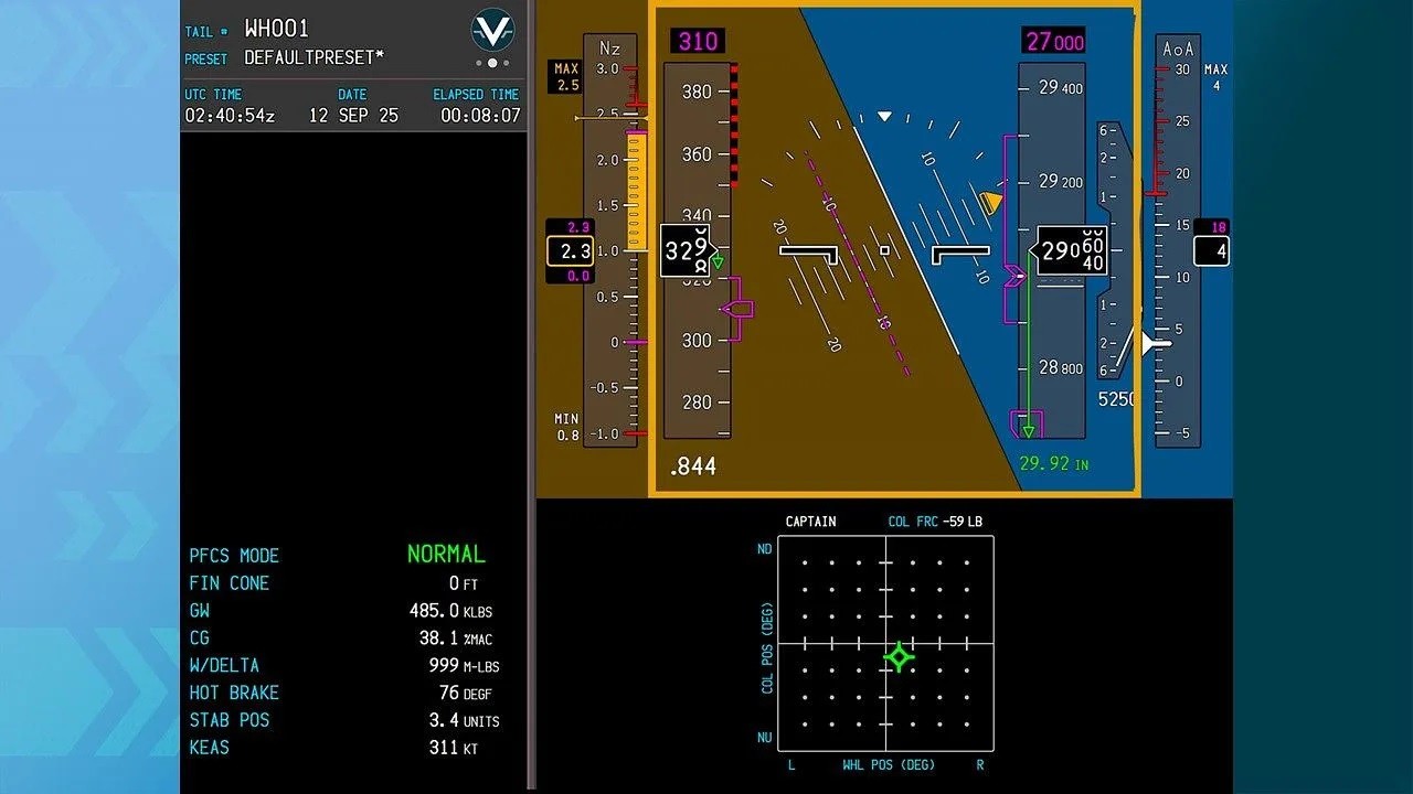 Now, pilots can activate VERA with the twist of a rotary switch. When selected, the existing primary flight display in front of the pilot is moved to the adjacent inboard screen, and VERA is displayed directly in front of the pilot. Tailored VERA features are available to help the pilot fly unique and complicated flight-test maneuvers.
