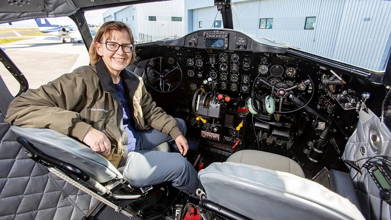 Above: Manager Vera Martinovich, shown at the controls of a DC-3, is remembered as an engineer, a pilot and a tireless champion for the people of Boeing. (Photo courtesy of Martinovich family)