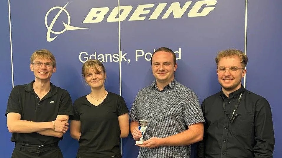 Boeing interns Michal Kisiolek, Maja Szymanska, Marek Lokaj and Oskar Grochowalski accept a group project award at LEAN Fest 2025 in Gdansk, Poland. (Photo © Boeing)