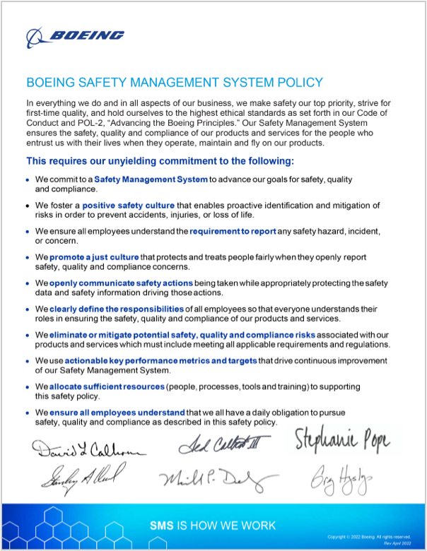 Boeing’s SMS Policy describes its commitment to the safety, quality and compliance of its products and services.