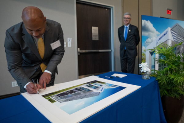 Howard McKenzie (left), Boeing Chief Engineer and Executive Vice President of Engineering, Test & Technology, signs an artist’s rendering of the forthcoming Boeing Center for Aviation and Aerospace Safety at Embry-Riddle. Looking on is Embry-Riddle President Dr. P. Barry Butler. (Embry-Riddle photo by David Massey)